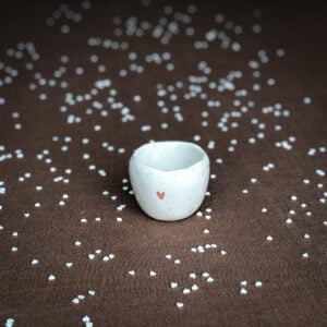 Nuotraukoje pateikti puodelis ir lėkštelė atspindi bendrą kūrinio dizainą, dydį ir spalvingumą, bet kiekvienas yra unikalus todėl matmenų paklaida gali būti ~ 1 cm, tūris svyruoti ~30 ml, svoris gali skirtis ~ 30 g, taip pat gali šiek tiek skirtis spalvų sodrumas.