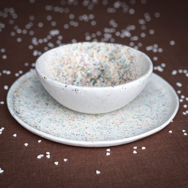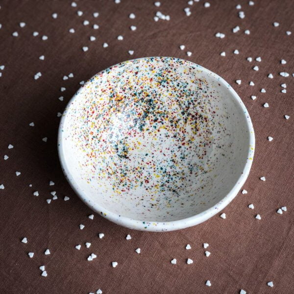 Made of white clay, covered with colorless glaze which contains multi-colored grains.