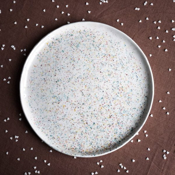 Made of white clay, covered with colorless glaze which contains multi-colored grains.
