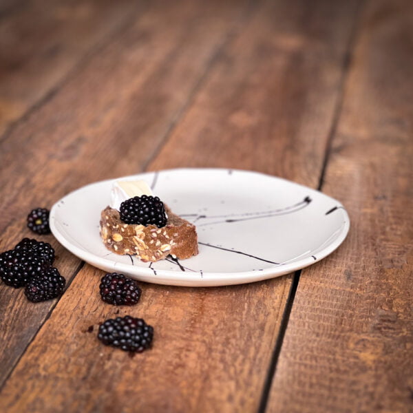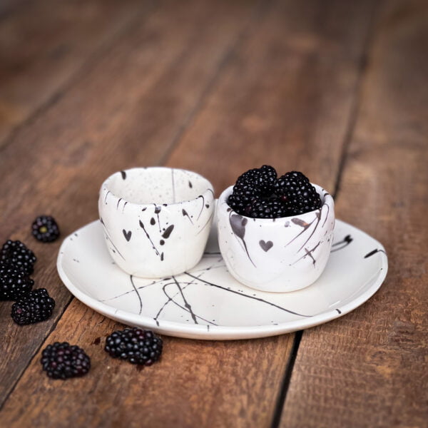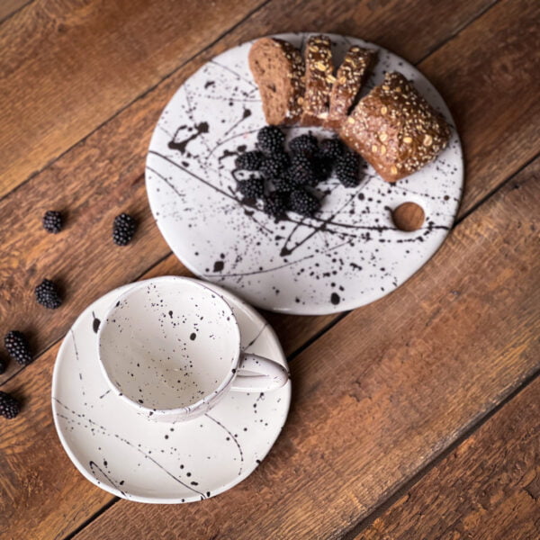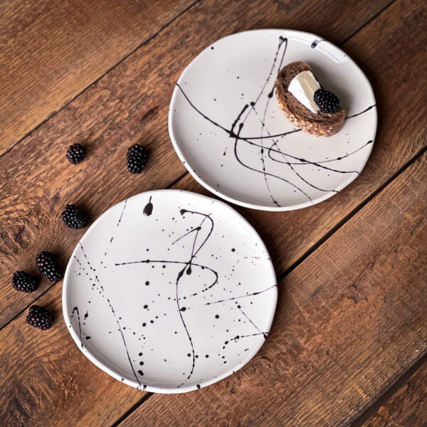 Black energetic strokes on a white background create a sense of dynamism. Even the simplest dishes will look like works of art on such a plate.